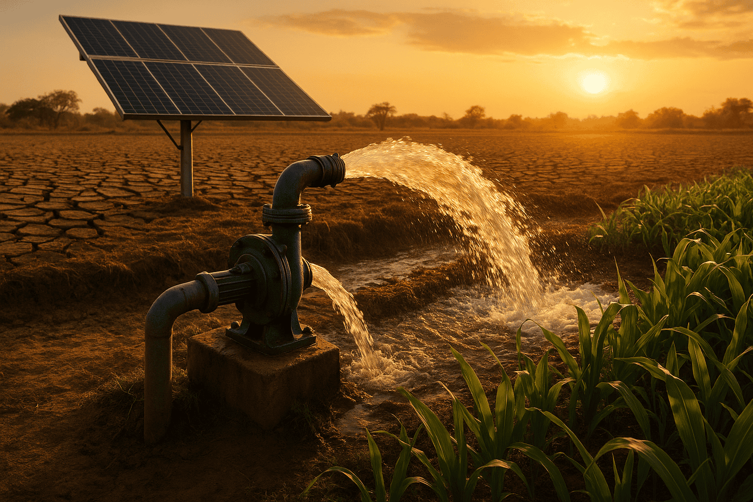 Solar water pumps use energy from the sun to move water from storage tanks, wells, or ponds to farmlands. They operate using photovoltaic (PV) panels, which convert sunlight into electricity that powers the pump motor.