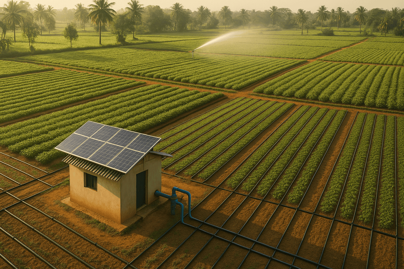 - Smart irrigation network (drip/sprinkler) to distribute efficiently